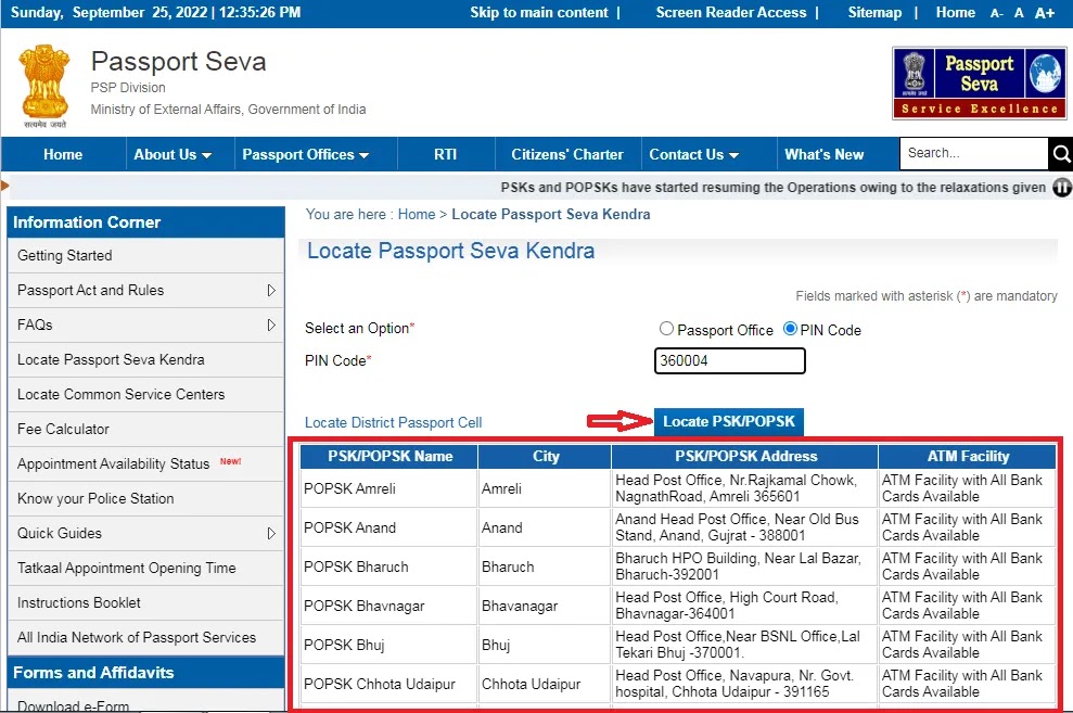 STEP 3: एक नया पेज खुलेगा जहां आप अपने पिनकोड या अपने शहर से passport seva kendra ढूंढ सकते हैं।