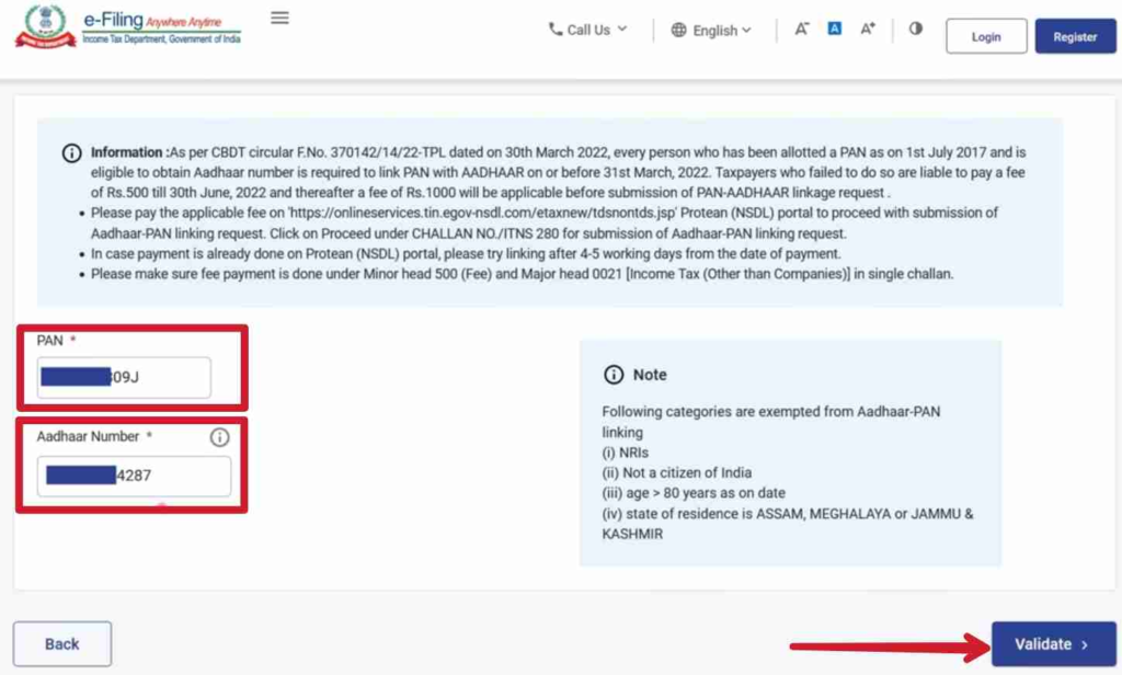 STEP 3: फिर एक नया पेज खुलेगा जिसमें आपको अपना आधार कार्ड नंबर और पैन कार्ड नंबर डालना है और Validate पर क्लिक करना है।