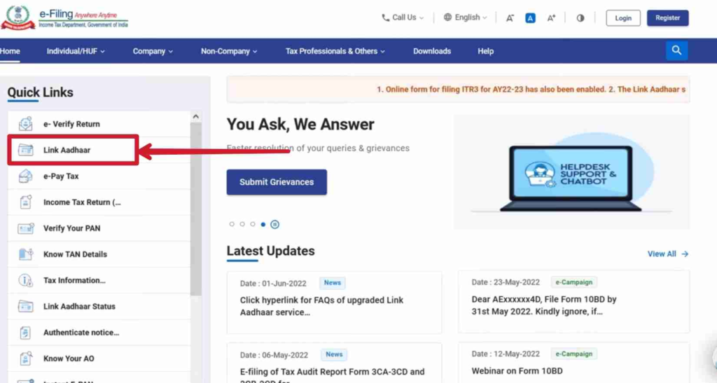 STEP 1: ई फाइलिंग पैन कार्ड को आधार कार्ड से लिंक करने के लिए सबसे पहले आपको वेबसाइट https://www.incometax.gov.in/iec/foportal पर जाना होगा।