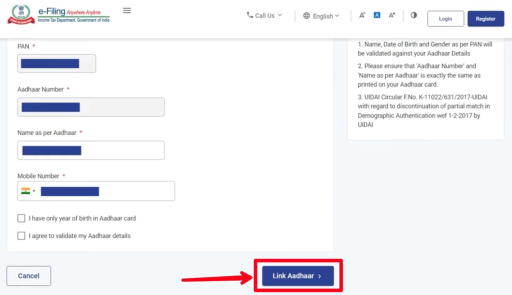 STEP 5: उसके बाद आपको पैन कार्ड नंबर, आधार कार्ड नंबर, आधार में नाम और मोबाइल नंबर डालना होगा। और Link Aadhar पर क्लिक करें। (Pan Aadhar Card Link)