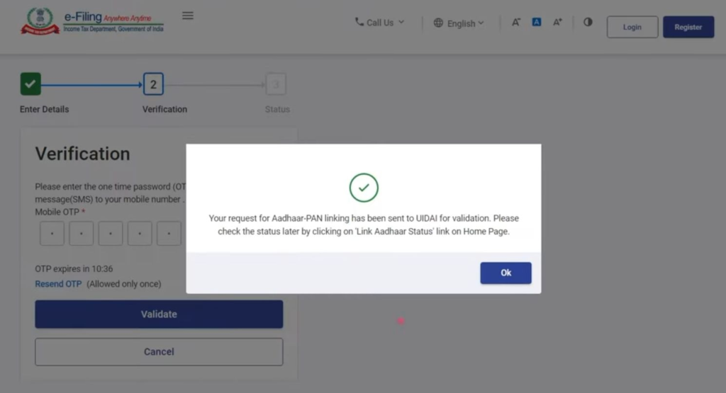 STEP 7: ओटीपी दर्ज करने के बाद आपको एक संदेश दिखाई देगा जो कहता है कि आपकी Pan Card Aadhar Card Link Process पूरी हो गई है अब आप पैन आधार लिंक स्थिति की चेक कर सकते हैं।