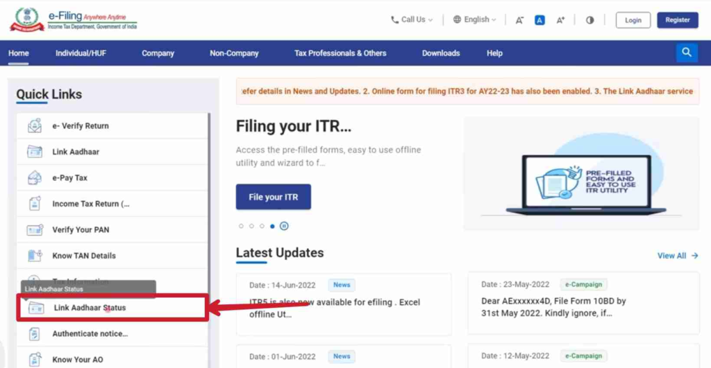 Pan Card Aadhar Card Link करने के लिए आपको इनकम विभाग की वेबसाइट incometaxindiaefiling.gov.in पर रजिस्ट्रेशन कराना होगा।