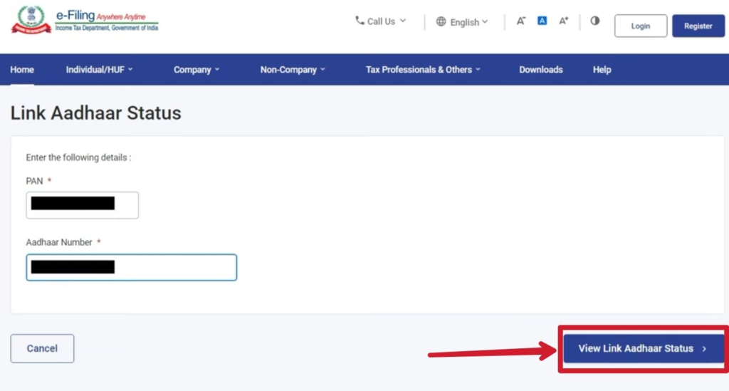 STEP 3: फिर एक नया पेज खुलेगा जिसमें आपको अपना आधार कार्ड नंबर और पैन कार्ड नंबर डालना होगा और View Link Aadhar Status पर क्लिक करना होगा।