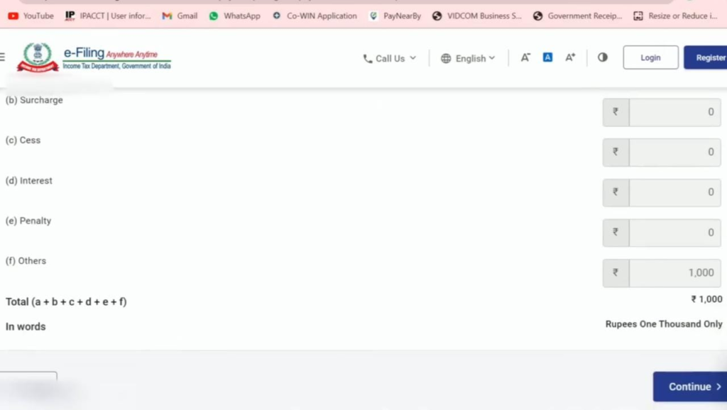 STEP 5: फिर आपको भुगतान की जाने वाली कुल राशि दिखाई देगी। 1000 अभी देना है तब आएगा। इसके बाद कंटिन्यू बटन पर क्लिक करें।